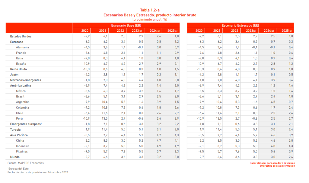 Para Estados Unidos, Mapfre Economics espera un aumento del PBI de 2,6% para este año y del 1,8% para el que viene a pesar del endurecimiento monetario que llevó a cabo la Reserva Federal (Fed) en los dos últimos años y que ya está empezando a revertir. Sin embargo, la inflación se mantendrá aún por encima del objetivo del 2% en el país, al situarse en el 2,9% para este año y en el 2,4% para 2025.