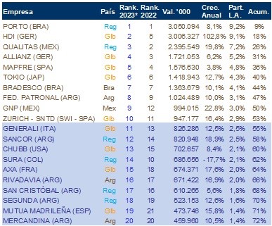 Los países con más alto crecimiento de primas entre diciembre 2022 y junio 2023 fueron México 19%, Costa Rica 14%, Argentina y Uruguay 12%, Colombia y Perú 10%, y Chile 9%, considerando que la región en su conjunto creció 11%.