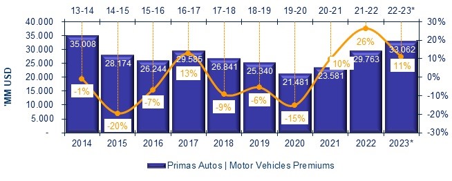 Las primas emitidas de autos en América Latina presentaron, a junio 2023, un monto de USD 33.062 millones: así lo indica un informe de LatinoInsurance On Line y reproducido por el boletín de Latino Insurance. Esta cifra, comparada con 2022, significa un aumento de 11% en volumen.