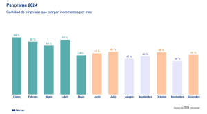 De acuerdo con Mercer, el panorama macroeconómico actual y el contexto de relativa incertidumbre continúan representando un reto para las organizaciones a la hora de ofrecer proyecciones para el año. Hasta mayo, los incrementos se situaban por encima de la inflación (81% vs. 72%).