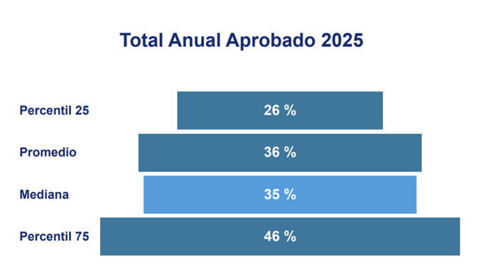 Los aumentos salariales se prevén que sean mayores en el primer semestre de 2025 y disminuirán en el segundo tramo del año. Durante los primeros meses, los aumentos tendrán una mediana del 18% y un promedio del 19%. Sin embargo, en el segundo semestre, estos valores caerán a una mediana del 14% y un promedio del 15%, y serán revisados en función de cómo se comporte la inflación. El 60% de las empresas ya tiene su presupuesto estimado para todo 2025, mientras que un 31% lo tiene estimado por sólo los tres primeros meses del año.