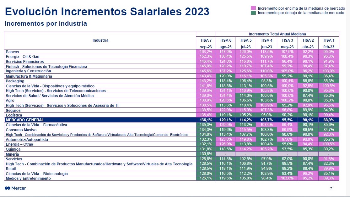 Respecto a los incrementos por industria, según la última encuesta TISA, las 14 industrias que darán incrementos por encima del mercado general (136,1%) son: Bancos (163,2%), Energía-Oil & Gas (152,3%), Servicios Financieros (146,4%), Fintech-Soluciones de tecnología financiera (146%), Ingeniería y construcción (145,6%), Manufactura y Maquinaria (143,4%), Packaging (143,2%), Ciencias de la vida-Dispositivos y equipo médico (141,6%), High Tech-Servicios de telecomunicaciones (139,6%), Servicios de Salud/Servicios de Atención médica (139%), Agro (138,9%), High Tech-Servicios y Soluciones de Asesoría de TI (138,5%), Seguros (138,5%), Logística (136,4%).