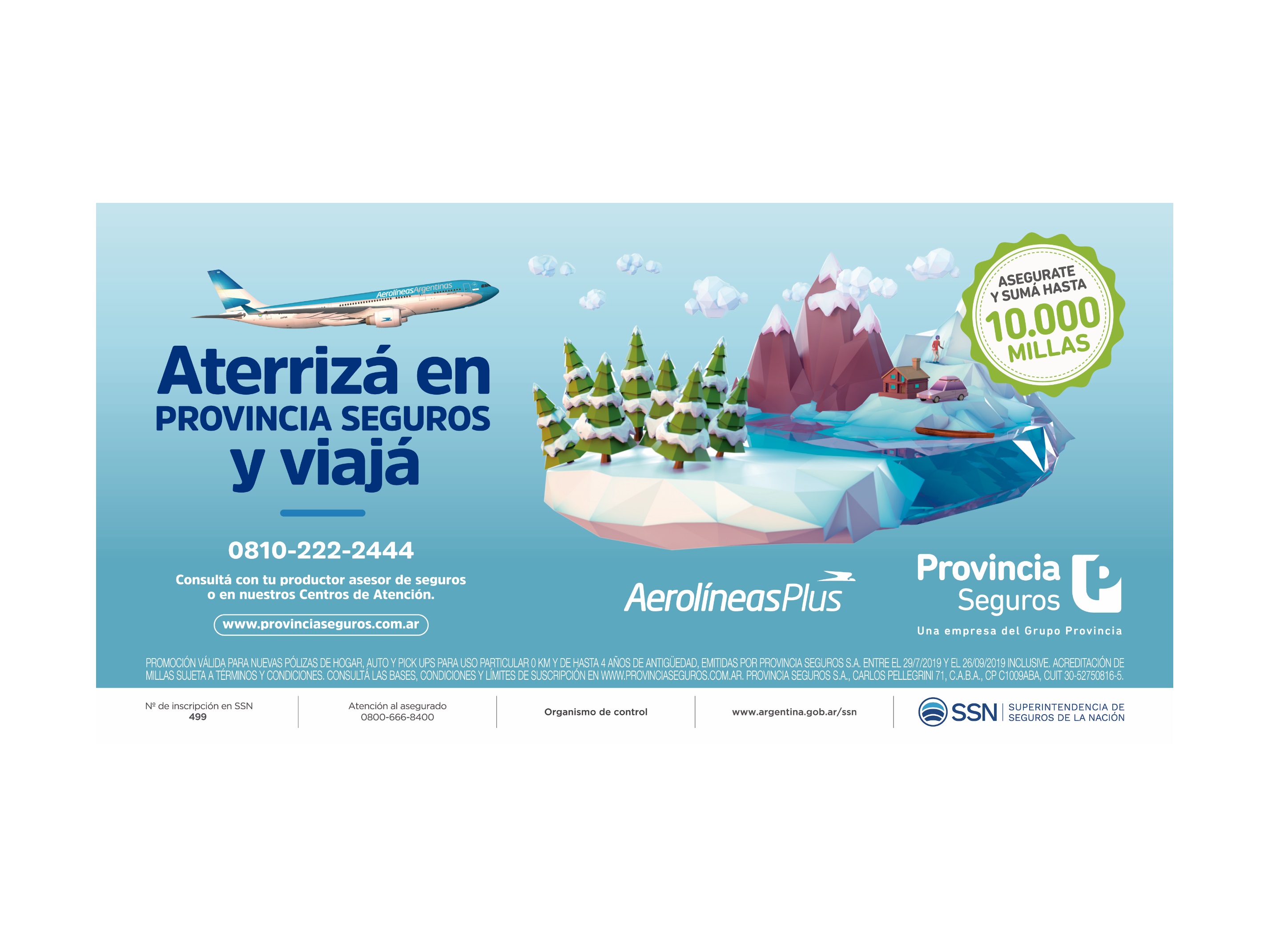 “Aterrizá en Provincia Seguros y viajá”. La promoción es accesible y ventajosa: contratando un seguro de auto o de hogar los clientes podrán sumar hasta 10 mil millas Aerolíneas Plus. Esta alianza comercial ya está disponible en todos los canales de venta.
