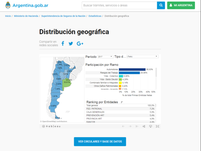 La Superintendencia de Seguros de la Nación (SSN) presentó una nueva modalidad on line para consultar datos del mercado asegurador argentino. Al ingresar a www.argentina.gob.ar/distribucion-geográfica se podrá acceder a estadísticas del sector de manera más práctica y ágil, seleccionando según el ramo de interés de cada compañía o usuario, la zona del país y el año de ejercicio económico.
