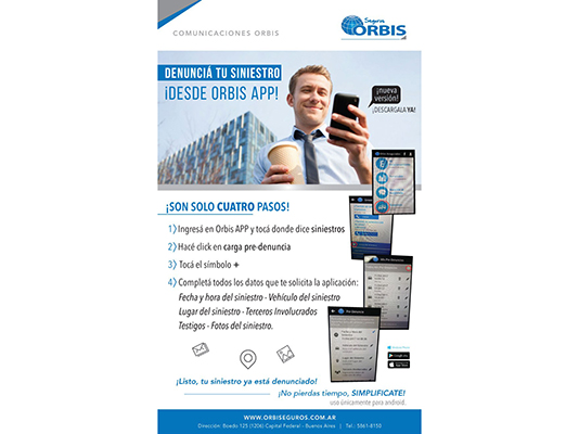 Orbis Seguros lanzó un nuevo módulo de denuncias online en su aplicación mobile Orbis APP Clientes. A partir de ahora, todos sus asegurados podrán realizar la pre-denuncia de su siniestro desde la comodidad de su smartphone. Para gestionar la misma, deberán ingresar en la aplicación, dirigirse al módulo de siniestros, y completar los campos que se solicitan. Entre los mismos encontramos: fecha y hora del siniestro, lugar, terceros involucrados, testigos, y fotos. Para completar toda esta información, el asegurado podrá además ingresar mensajes de voz e imágenes que aporten información adicional del siniestro. En un principio, estará sólo disponible para Android, sumando Iphone y Windows Phone al mes de su lanzamiento.