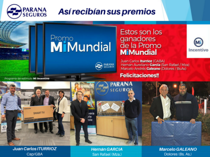 En la primera semana de junio, Paraná Seguros entregó los premios del concurso Mi Mundial a los tres productores asesores ganadores. Resultaron merecedores de la distinción Juan Carlos Iturrioz, Hernán García y Marcelo García. Todos merecieron el reconocimiento de la compañía por su desenvolvimiento profesional, a la vez que se agradeció a todos los productores por el apoyo que brindaron a esta iniciativa desarrollada en el marco del concurso anual Mi Incentivo.