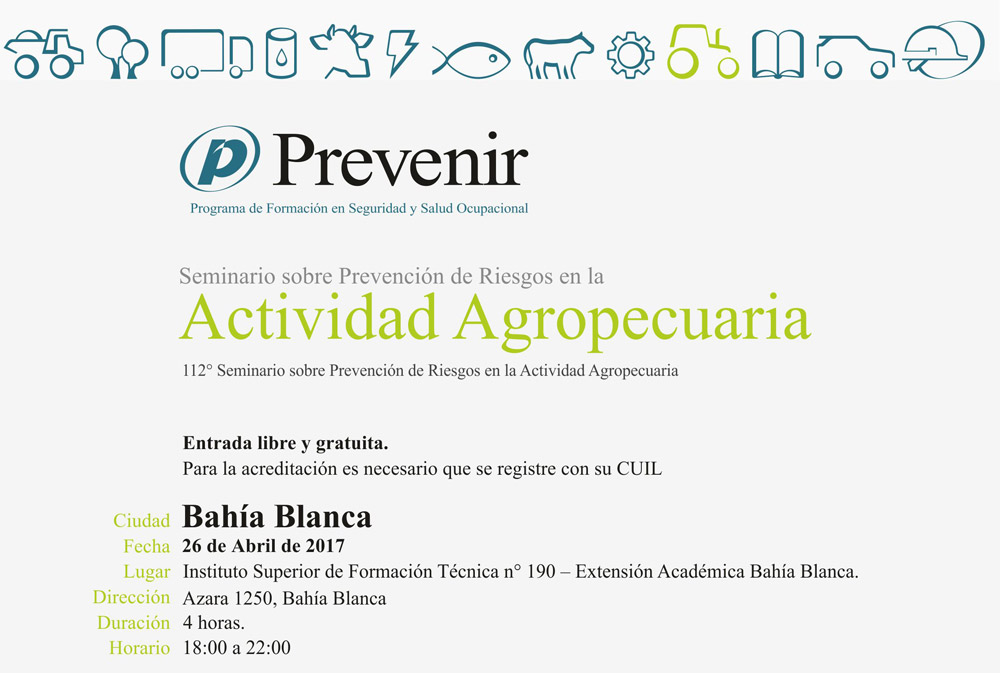 El próximo miércoles 26 de abril, la Unión de Aseguradoras de Riesgos del Trabajo (UART) llevará a cabo en la ciudad de Bahía Blanca un nuevo seminario, el N° 112, de su ciclo Prevenir, coordinado por la Fundación Iberoamericana de Seguridad y Salud Ocupacional (FISO), en el que expertos en la actividad agropecuaria ahondarán sobre los beneficios de las buenas prácticas para una producción sustentable e inocua, y la importancia de la inversión en prevención, entre otros temas.