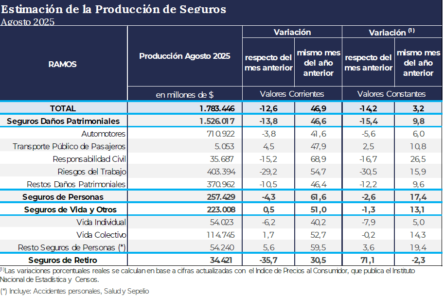 A valores constantes y comparados con agosto de 2024, los seguros patrimoniales avanzaron un 9,8% y los de personas crecieron un 17,4% a agosto pasado. Respecto del primer segmento, se incrementaron todos los ramos: responsabilidad civil (26,5%), riesgos del trabajo (15,9%), transporte público de pasajeros (10,8%), resto de seguros patrimoniales (9,6%) y automotores (6%).