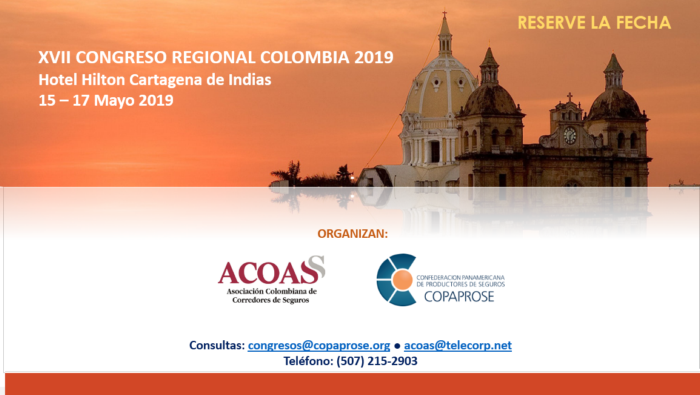 La Asociación Colombiana de Corredores de Seguros (ACOAS) programó una nueva fecha para la celebración del XVII Congreso Regional de la Confederación Panamericana de Productores de Seguros (COPAPROSE), que se llevará a cabo en el Hotel Hilton de Cartagena de Indias, Colombia, durante los días 15, 16 y 17 de mayo. Próximamente se estarán compartiendo todos los detalles de este evento a través de la web de la Confederación (http://www.copaprose.org/).