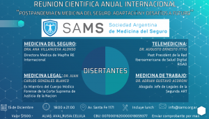 La Sociedad Argentina de Medicina del Seguro (SAMS), una sociedad científica médica sin fines de lucro, organiza su Reunión Científica Anual Internacional. Tendrá lugar el jueves 15 de diciembre de 2022 de manera presencial en la sede de la Asociación Médica Argentina (AMA), ubicada en Av. Santa Fe 1171, Ciudad de Buenos Aires. El evento se realizará de 18 a 21 horas e incluye lunch.