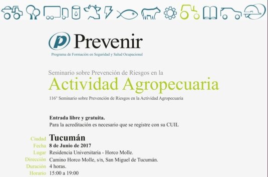El próximo jueves 8 de junio, la Unión de Aseguradoras de Riesgos del Trabajo (UART) llevará a cabo en la ciudad de San Miguel de Tucumán un nuevo seminario de su ciclo Prevenir, coordinado por FISO, en el que expertos en la actividad agropecuaria ofrecerán las claves para un manejo responsable de fitosanitarios y animales. Asimismo, presentarán un análisis de costos y beneficios para gestionar exitosamente la prevención de riesgos. El evento tendrá lugar entre las 15 y las 19 horas en la Residencia Universitaria – Horco Molle (Camino Horco Molle s/n).