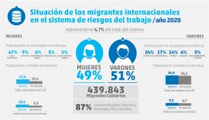 La SRT informó que la población de migrantes internacionales con cobertura de riesgos del trabajo es de 439.843 trabajadoras y trabajadores (4,7% del total de población cubierta). Este colectivo está compuesto por un 49% de mujeres y el 87% proviene de países limítrofes y de Venezuela, Perú y Colombia.
