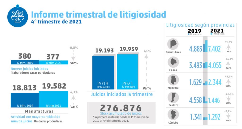 En esa línea, los datos del Registro Nacional de Litigiosidad (ReNaLi) mostraron que solamente en el último trimestre del año anterior se iniciaron 19.959 expedientes judiciales, un 4% más que en el cuarto trimestre de 2019. De los trámites iniciados, 19.582 fueron de trabajadoras y trabajadores de unidades productivas y 377 fueron litigios de trabajadoras y trabajadores de casas particulares.