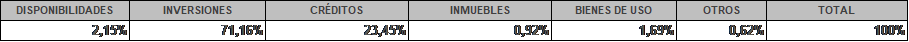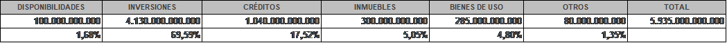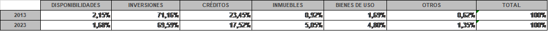 Del análisis efectuado se desprende que las disponibilidades se mantuvieron constantes en alrededor del 2%, las inversiones también en un 70% y los cambios se pueden apreciar en el rubro inmuebles (aumentó cuatro veces de casi un 1% a 5%) y en bienes de uso, que casi se triplicaron (de un 1,7% a un 4,8%). Los créditos disminuyeron de casi un 24% a un 18% (una disminución del 25%).
