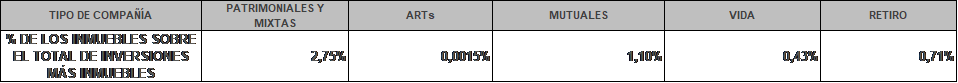 Las patrimoniales y mixtas triplicaron el porcentaje destinado a inmuebles de casi el 3% a más del 9%, caso parecido a las mutuales, que lo hicieron del 1% a casi el 10%. En el resto de las compañías, los aumentos fueron muy significativos, incluso desde porcentajes muy bajos como es el caso de las ART, de 0,0015% a más del 2%.