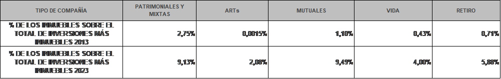 Y, finalmente, si comparamos estos números con los que las compañías destinaban para inmuebles en su cartera de inversión en 2013 y en 2023, obtenemos lo siguiente: