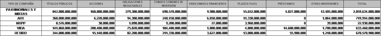 Si queremos incluso desagregar más estos números, podríamos realizar un análisis de los rubros en los que invierte cada tipo de compañía, ya sean patrimoniales, de riesgos del trabajo (ART), mutuales del transporte público de pasajeros (MTPP), de vida o de retiro.