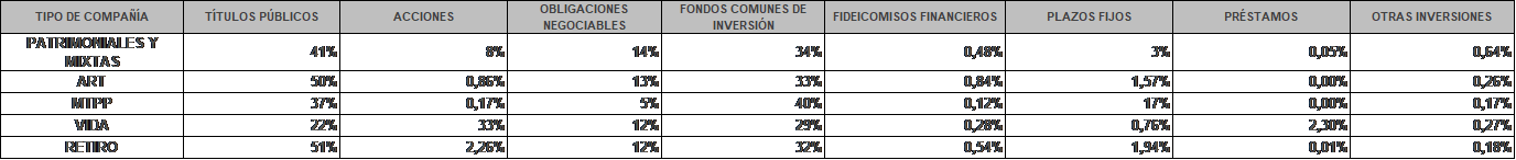 Casi todas las compañías centran sus inversiones principalmente en los títulos públicos y los fondos comunes de inversión. En el caso de las ART y las compañías de retiro, el 50% de sus inversiones están destinadas a los títulos públicos. En porcentajes similares, patrimoniales y MTPP destinan alrededor del 40% en este tipo de inversión.