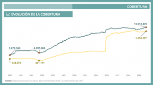 Tomando como fuente datos analizados por la UART, desde el mes de agosto de 2020, durante la pandemia en la que la cobertura alcanzó sus menores valores, se observa una recomposición del empleo del sector privado, que fue acompañada en menor medida por el sector público. Según datos del Ministerio de Trabajo, el empleo privado tuvo un aumento del 6,2%, lo que representa 350 mil nuevos puestos generados en mayor medida por los sectores de industria, construcción y comercio, mientras que el empleo público creció 3,3%, lo que se traduce en 100 mil nuevos trabajadores para dicho sector.