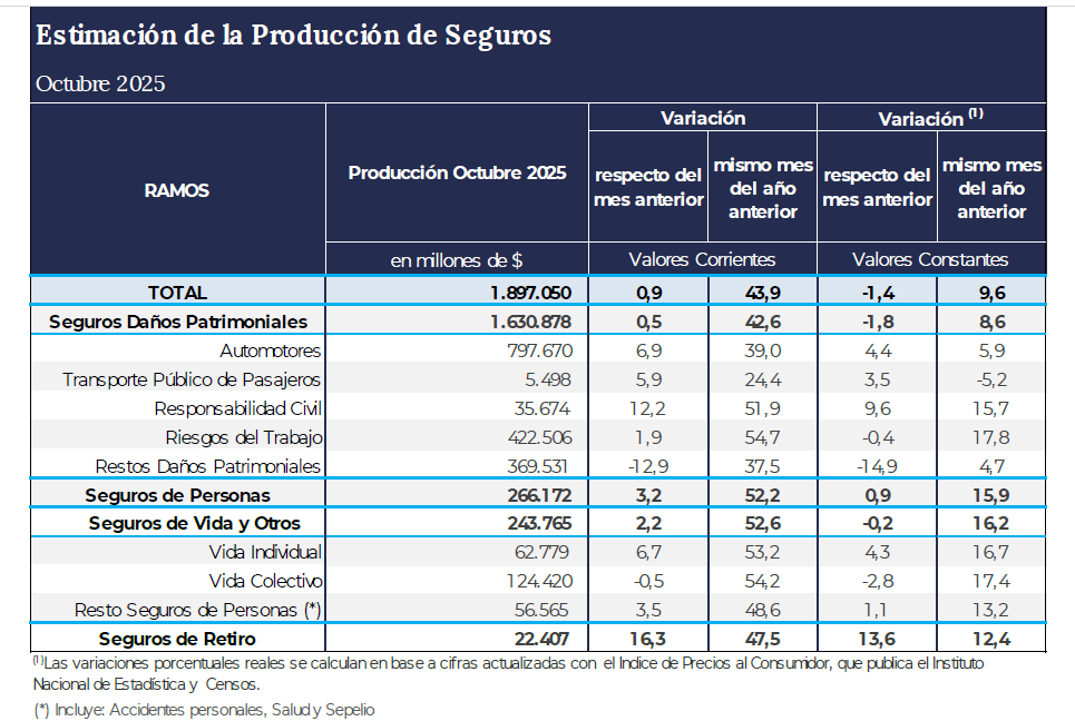 De acuerdo con una reciente circular de la Superintendencia de Seguros de la Nación (SSN), las ventas del mercado asegurador durante octubre de 2025 alcanzaron los 1.897,1 miles de millones de pesos. De esta manera, a valores corrientes, la producción creció un 43,9% respecto de octubre de 2024. En tanto, a valores constantes, el avance respecto del mismo mes del año anterior fue del 9,6%, pero retrocedió un 1,4% en la comparación intermensual.