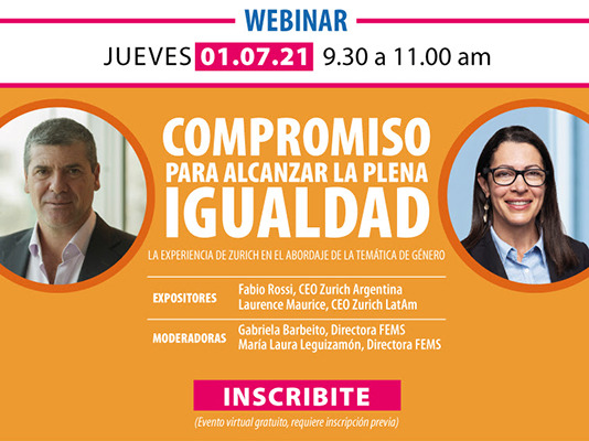 El jueves 1° de julio a las 9.30 horas, el Foro Ejecutivo de Mujeres en Seguros (FEMS) y Zurich organizarán el webinar “Compromiso para alcanzar la plena igualdad”. Allí, se brindará la experiencia de Zurich en el abordaje de la temática de género.
