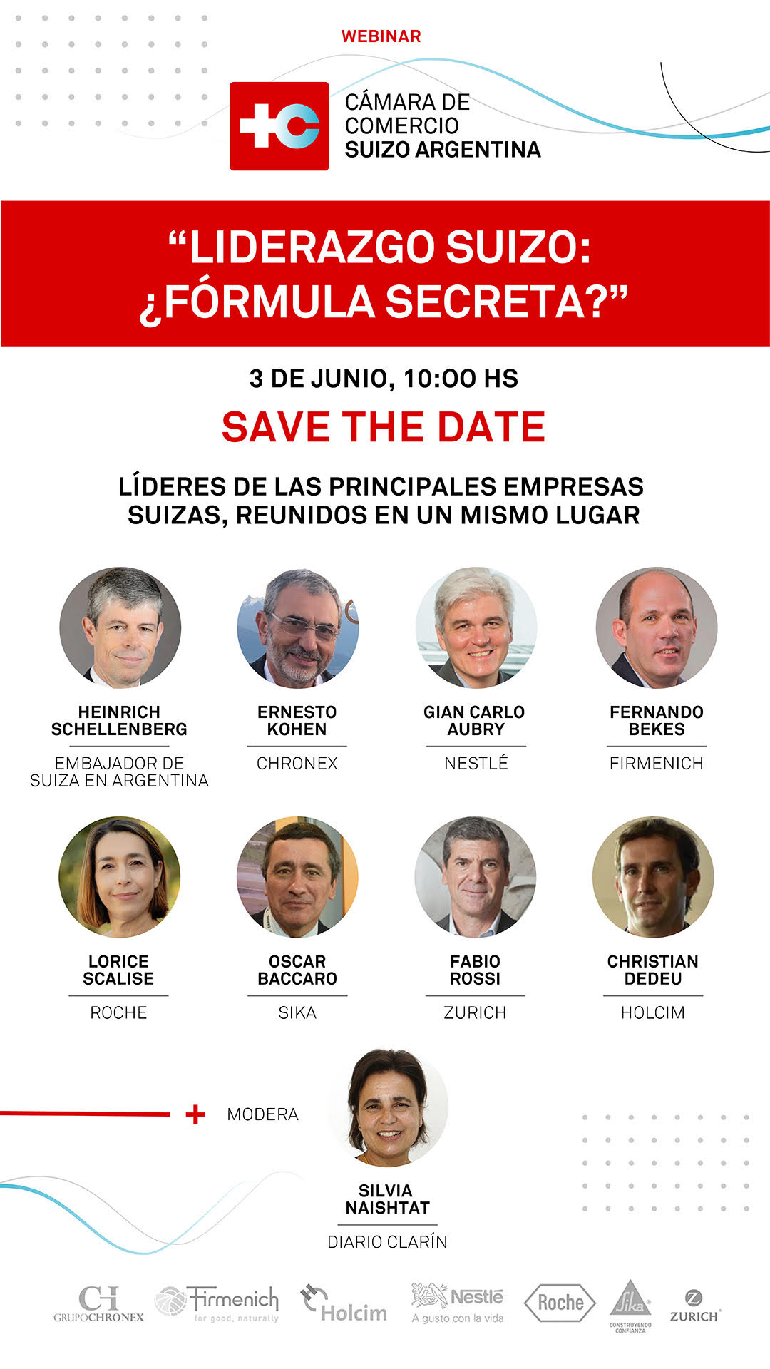 La charla contará con la moderación de Silvia Naishtat, periodista del diario Clarín, y entre los expositores se encuentran: Heinrich Schellenberg, embajador de Suiza en Argentina; Ernesto Kohen, de la empresa Chronex; Gian Carlo Aubry, de Nestlé; Fernando de Bekes, de la empresa Firmenich; Lorice Scalise, representando a Roche; Oscar Baccaro, de Sika; y Christian Dedeu, de la empresa Holcim